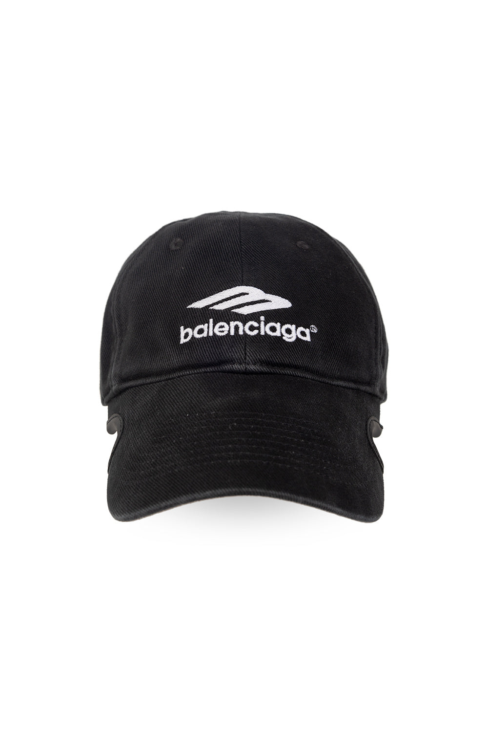 Black baseball cap from Balenciaga. Made of cotton with a vintage treatment, this item features white logo embroidery on the front, rubberized cut outs on the peak and a Velcro fastener at the back.