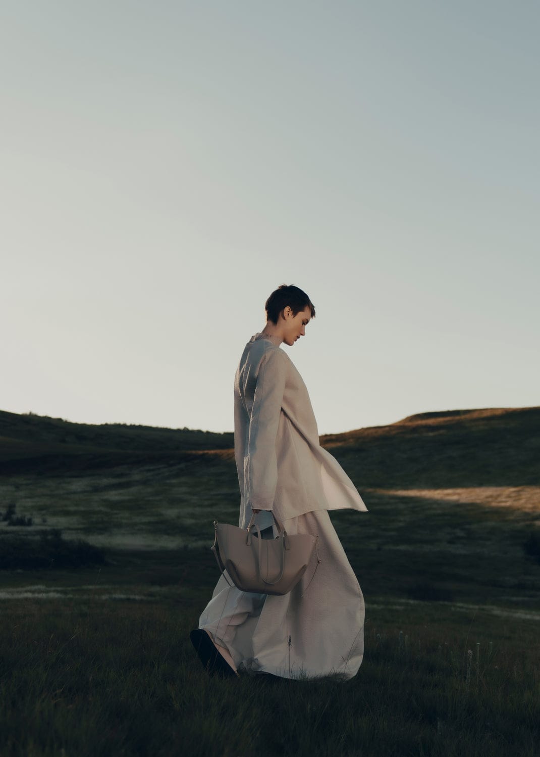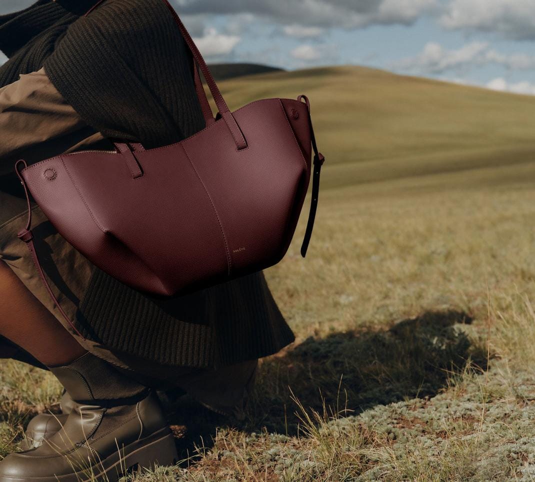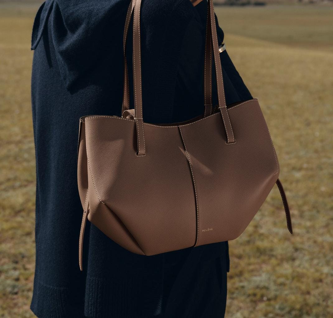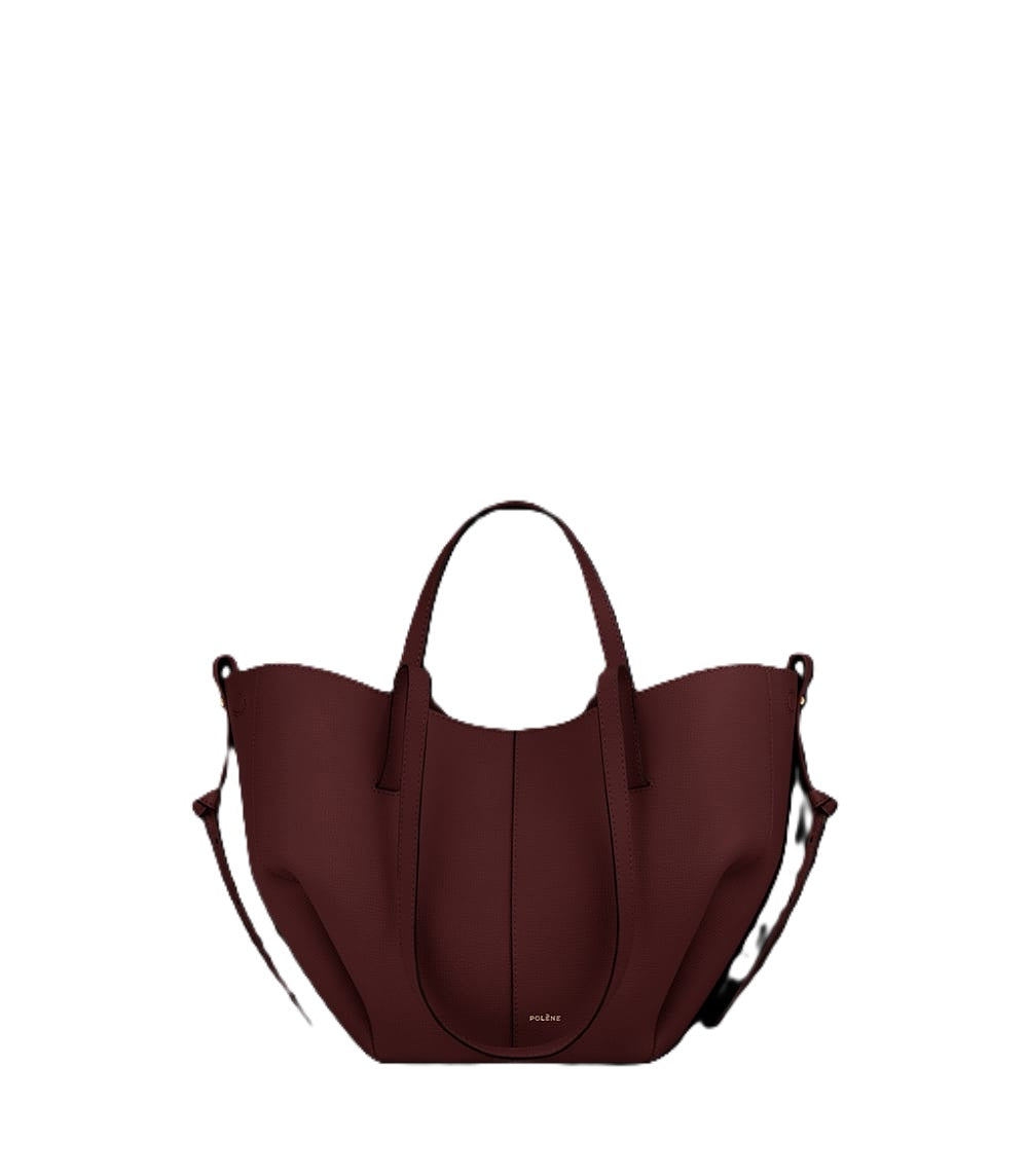 This sculptured compact tote bag featuring waves, folds, and curves can be used in two ways. Basket-style, with its sides open and straps on the outside, or As a flower-like closed bag, with its sides tucked in and its straps crossed on the inside