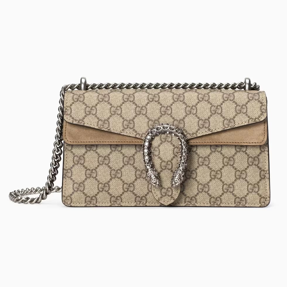 A structured GG Supreme canvas chain medium shoulder bag with a key ring that can be used to attach this bag to a separate larger bag. The closure has the textured tiger head spur closure-a unique detail referencing the Greek god Dionysus, who in myth is said to have crossed the river Tigris on a tiger sent to him by Zeus. The accessory can also be worn as a crossbody bag.