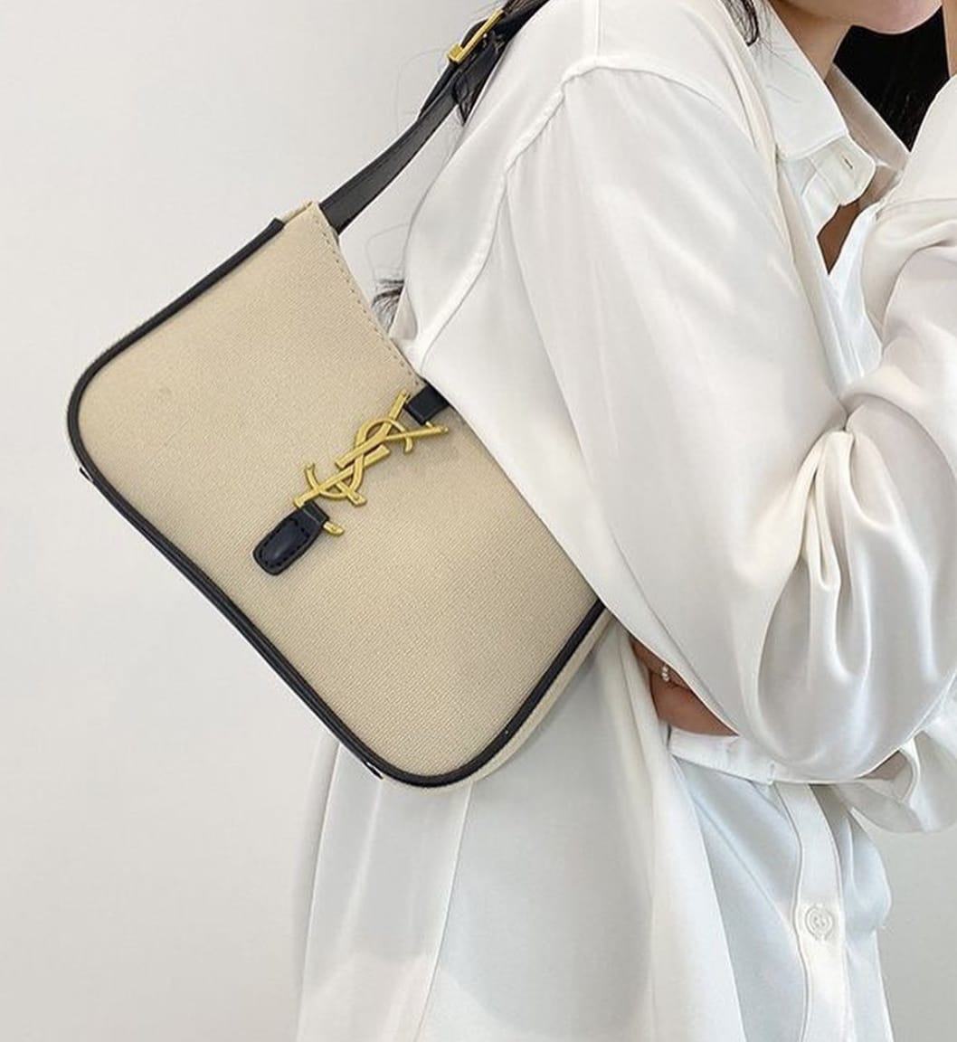 Hobo bag with leather strap closure, Le Cassandre print and tone-on-tone suede lining.