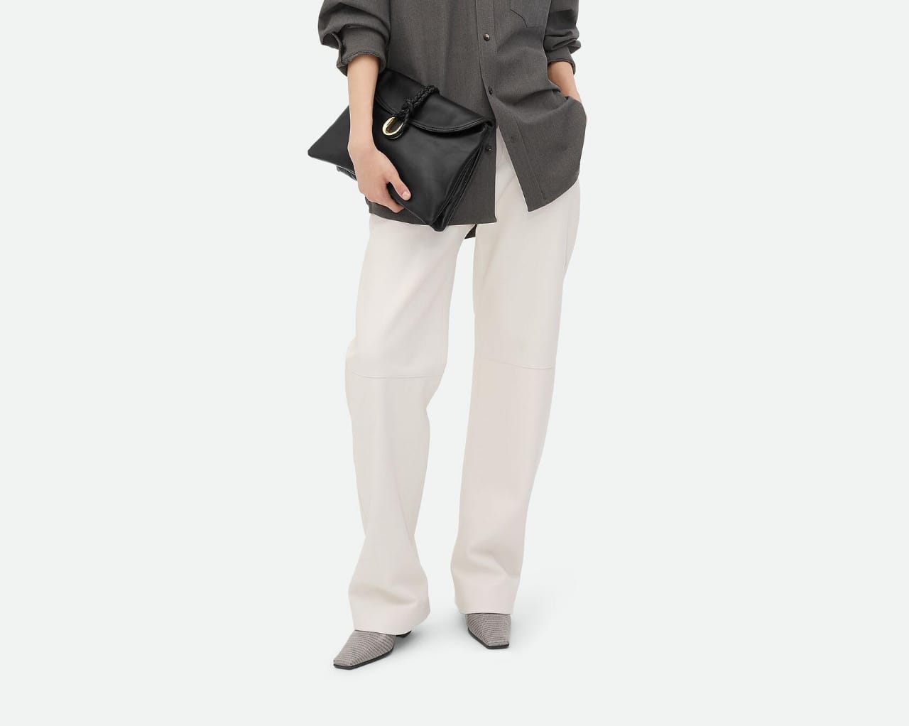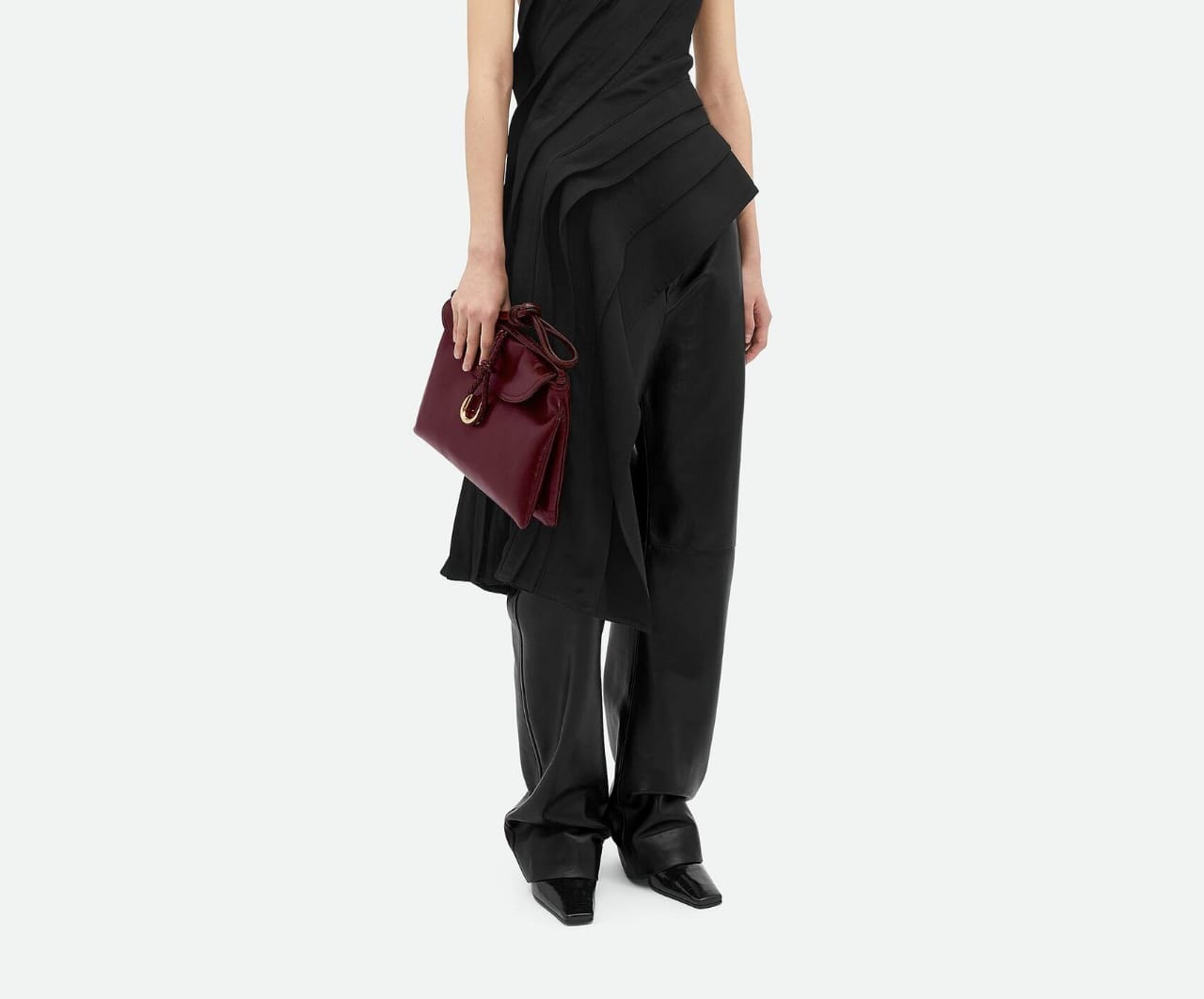 Cross-body bag in smooth calf leather with double flap. Fastened with a sculptural metal closure and leather coaxial cord.
