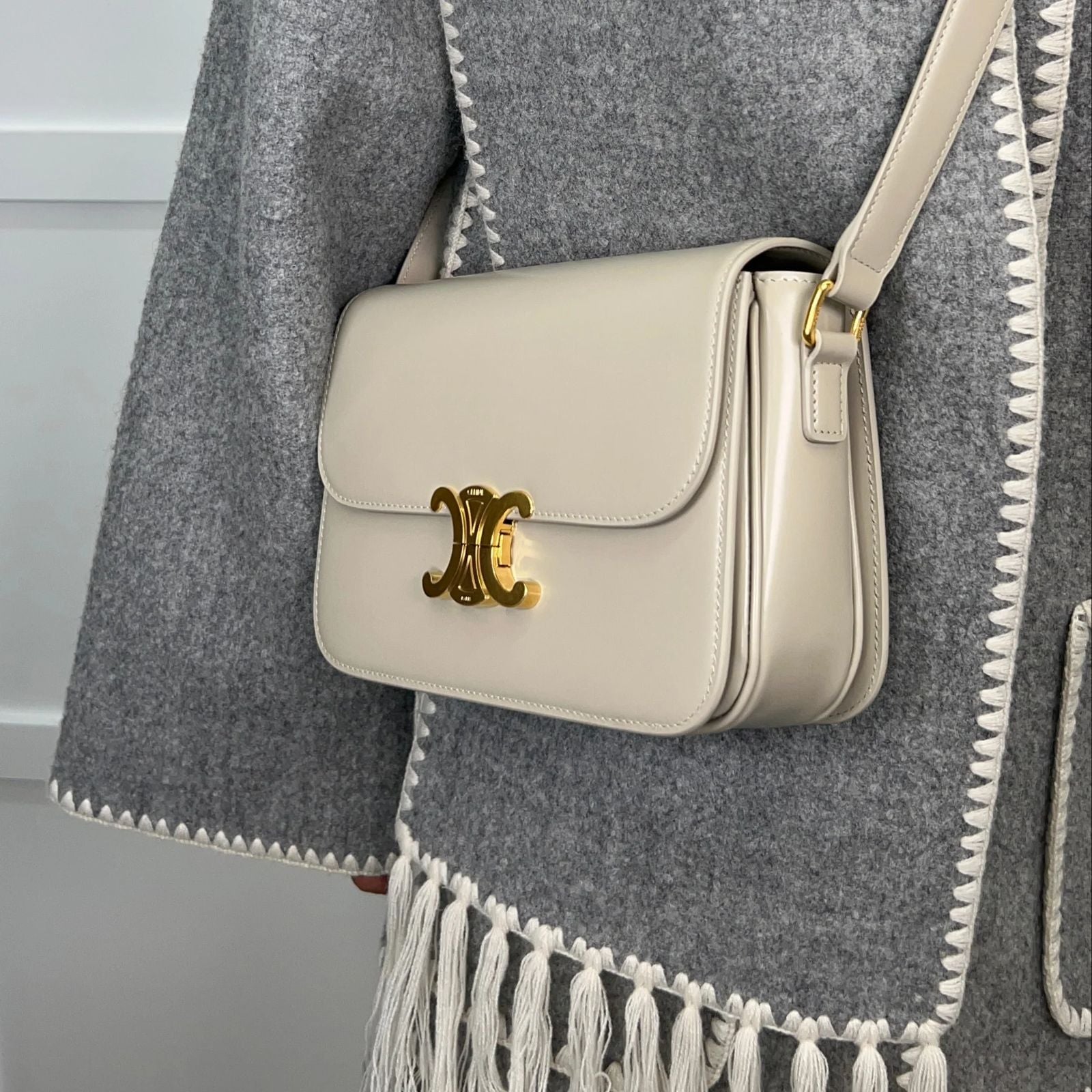 MEDIUM TRIOMPHE BAG IN SHINY CALFSKIN WITH AN ADJUSTABLE LEATHER SHOULDER STRAP. THE BAG CLOSES WITH A TRIOMPHE CLASP